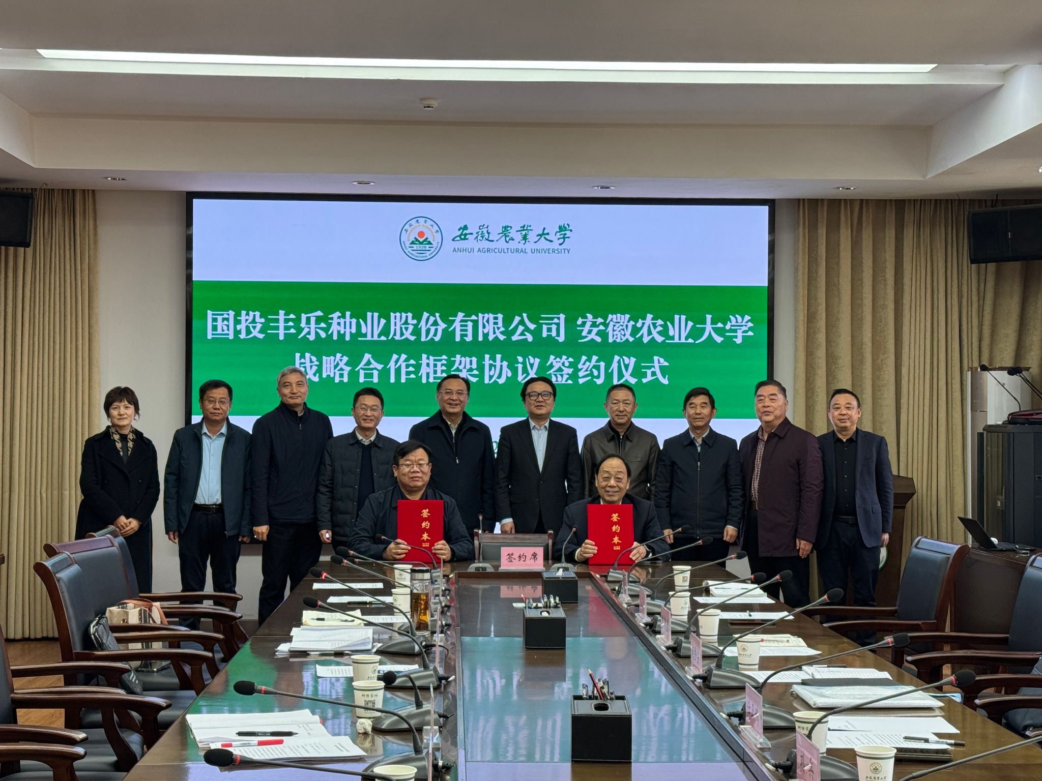 本网讯 12月5日上午,安徽农业大学与国投丰乐种业股份有限公司战略合作框架协议签约仪式举行。校党委副书记、校长操海群,国投种业副总经理、国投丰乐党委书记、董事长戴登安,国投丰乐种业副总经济师、玉米研究院院长任正鹏,国投丰乐种业副总农艺师、企业管理部部长陈德胜等出席签约仪式。党委常委、副校长江海洋主持会议。会议强调,双方要以此次合作签约为新起点,建立常态化联络机制,深化务实合作,充分嫁接“1+5”农业科技创新联盟单位教育、...