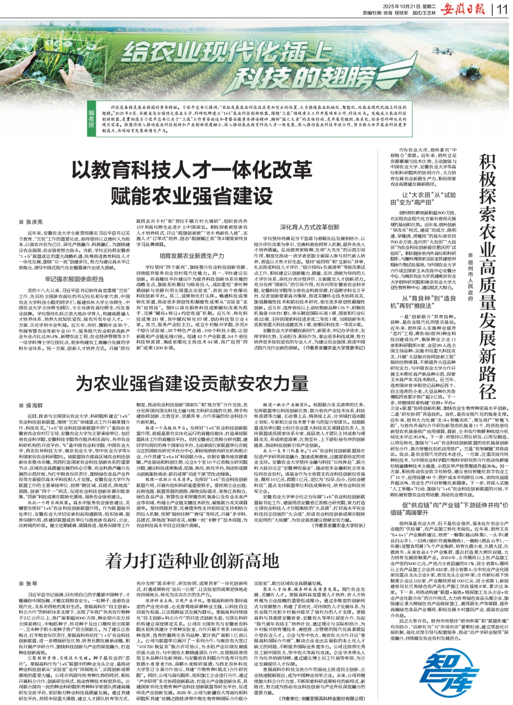 本网讯 10月21日,《安徽日报》思想周刊“智库”版整版刊发“1+5”农业科技创新联盟成员单位理论文章,集中呈现了各成员单位在推动联盟建设中的深入思考与实践探索。校党委书记张庆亮发表题为《以教育科技人才一体化改革赋能农业强省建设》的署名文章。文章从牢记强农报国使命担当、培育发展农业新质生产力、深化育人方式改革创新三个维度展开,系统阐述学校将以联盟成立为契机,进一步强化学科优势、主动担当作为,力争产出更多高水平科技成果,...