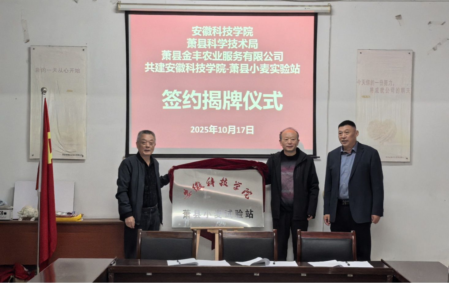 本网讯 10月17日上午,“安徽科技学院.萧县小麦试验站”揭牌仪式在宿州市萧县黄口镇顺利举行。该试验站由安徽科技学院、萧县科学技术局、萧县金丰农业服务有限公司三方共同建设,是校地企协同推动小麦产业高质量发展的又一重要举措。试验站作为校地企协同合作的重要载体,将深入整合小麦种质创新、智慧育种、良种繁育、智慧耕种管收、技术推广与人才培训等领域的专家团队资源,聚焦前沿育种技术攻关、新品种培育与小麦纯度快速鉴定等核心任务,...