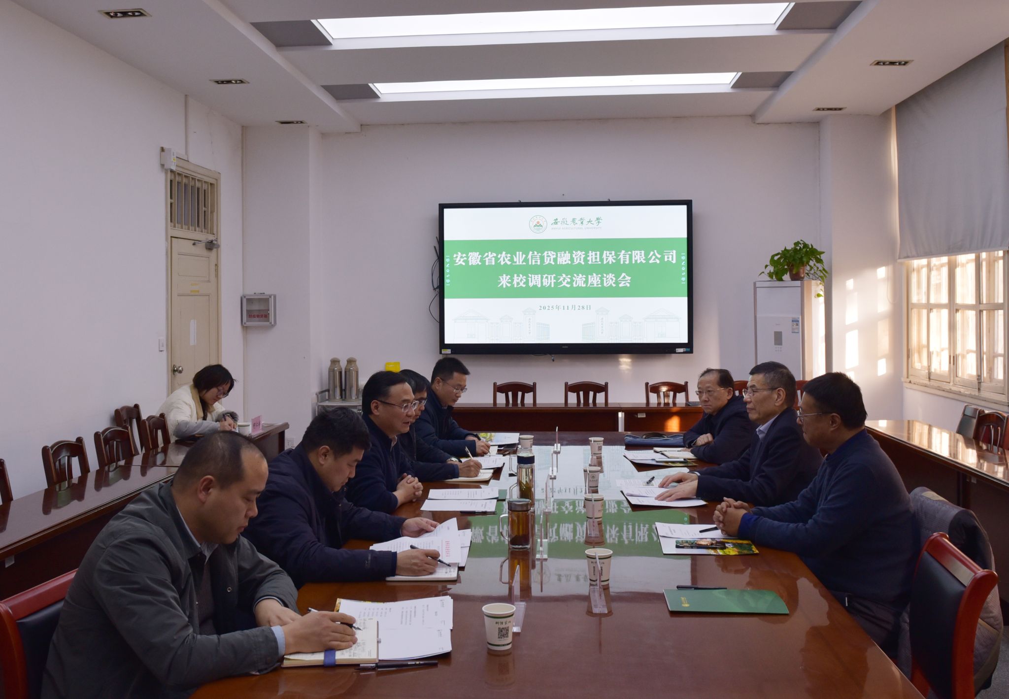 本网讯 11月28日下午,安徽省农业信贷融资担保有限责任公司党委书记、董事长方习利一行来联盟秘书处调研,就深化与“1+5”农业科技创新联盟合作座谈交流。联盟秘书处秘书长操海群,安徽农业大学党委常委、副校长蔡德军出席会议。操海群代表学校对方习利一行来访表示热烈欢迎,并介绍了“1+5”农业科技创新联盟、安徽省江淮粮仓研究院成立的背景与重要意义。他指出,双方要以此次座谈为契机,强化合作机制体制创新,共同组建农业科技金融技术研发和成果转化平台,...
