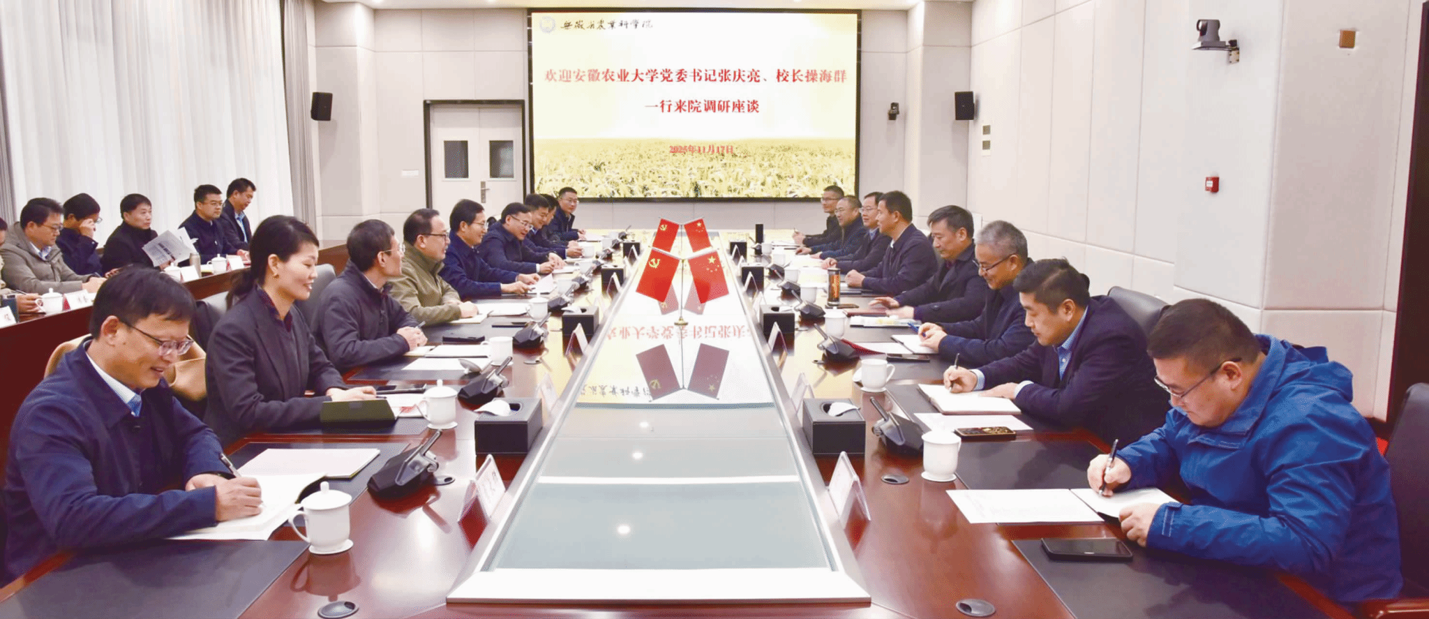 本网讯 凝聚农业科教力量,服务农业强省建设。11月17日上午,联盟秘书处单位、安徽农业大学党委书记张庆亮,联盟秘书长、校长操海群,党委常委、副校长陈黎卿一行赴安徽省农科院调研,谋划推进校院合作走深走实。农科院党组书记、院长张正竹主持召开座谈会,副院长赵皖平、李成、戚仁德参加座谈会。陈黎卿、李成代表双方签署战略合作协议。座谈会上,双方深入学习贯彻党的二十届四中全会精神,围绕落实落细省委、省政府关于“1+5”农业科技创新联盟工作要求,...