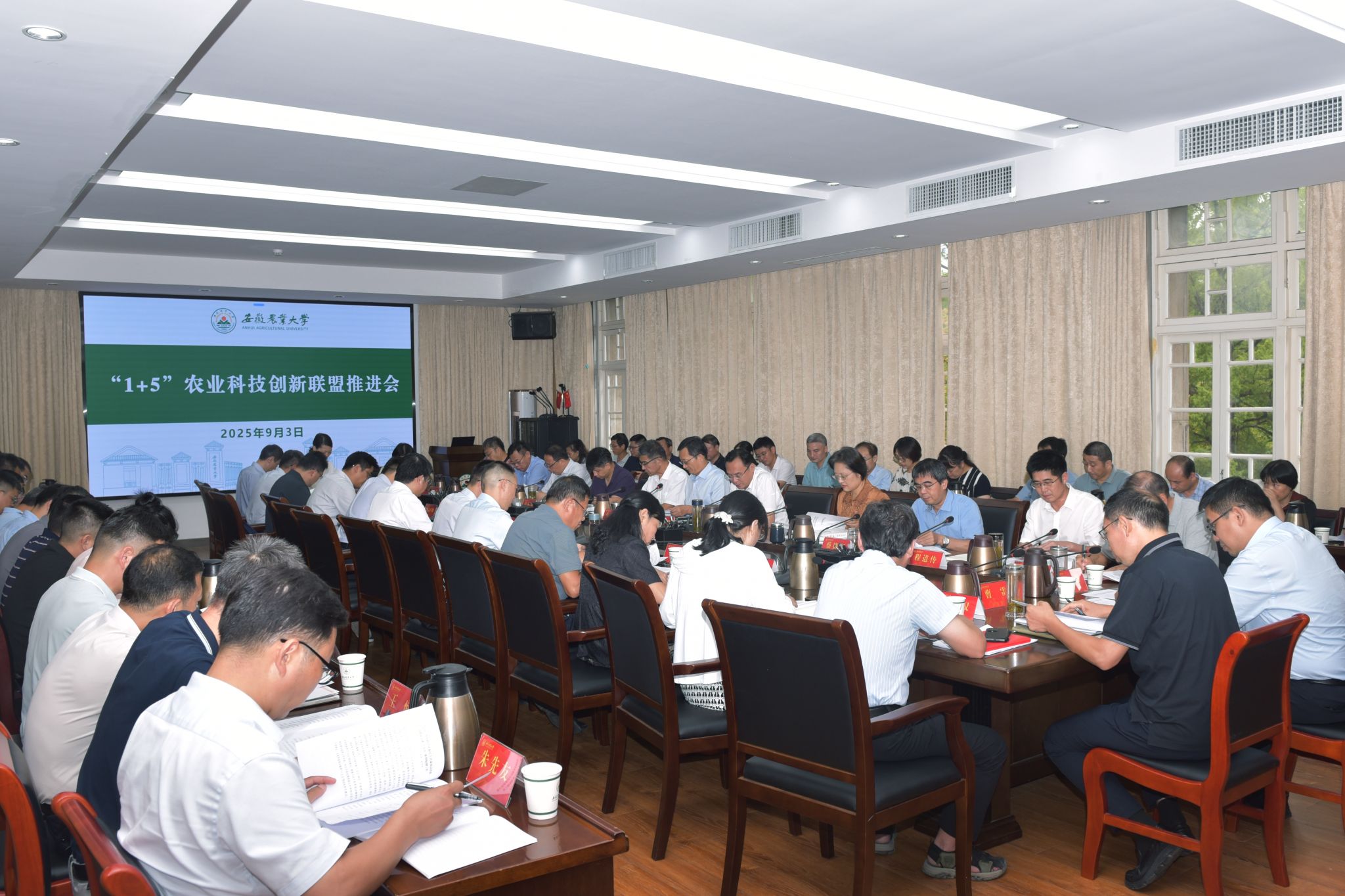本网讯 9月3日下午,我校召开“1+5”农业科技创新联盟工作推进会。校领导张庆亮、操海群、董雨、李红、吴祥为、蔡德军、陈黎卿、程道传、江海洋,学术副校长吴文革、姜东出席会议。校直各单位、机关各部门、各学院主要负责同志参加会议。