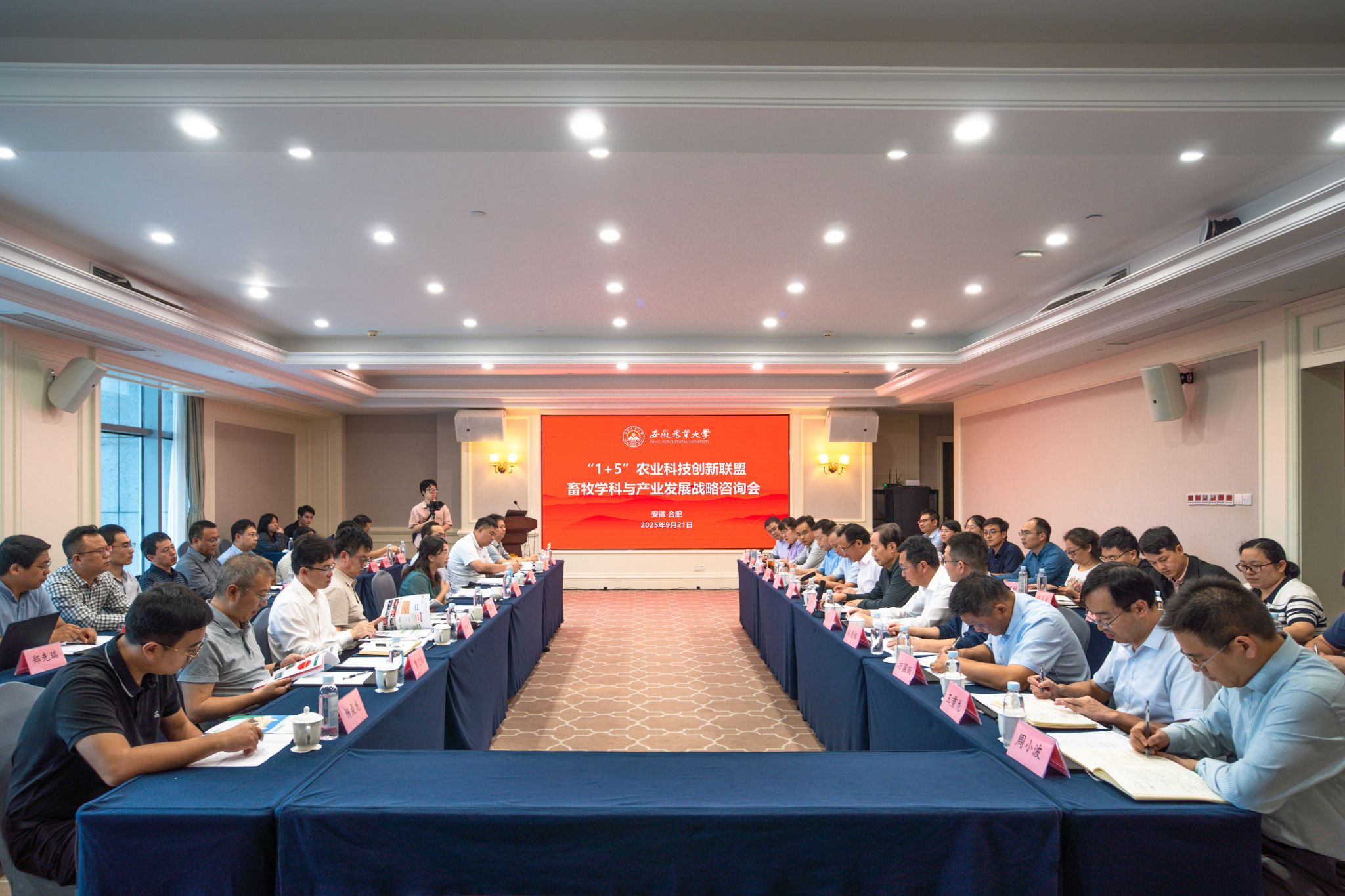 本网讯 9月21日下午,“1+5”农业科技创新联盟畜牧学科与产业发展战略咨询会在合肥举行。校党委副书记、校长操海群,学术副校长吴文革出席会议。中国农业科学院北京畜牧兽医研究所、中国农业大学动物科技学院、西北农林科技大学动物科技学院、华中农业大学动物科技学院动物医学院、南京农业大学动物科技学院、安徽省农业农村厅、安徽省农业科学院畜牧兽医研究所、安徽科技学院动物科技学院等单位负责同志应邀出席。校科技处、发展规划处、社会合作处、动物科技学院相关负责人和团队代表参会。